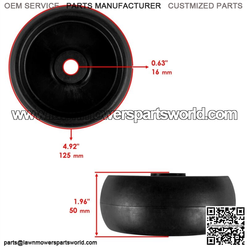Premium Quality Replacement PartMOWER DECK WHEELDimension:Bore: 0.63″ – 16 mmWidth: 1.96″ – 50 mmOD: 4.92″ – 125 mmCompatible with Following JOHN DEERE Models:102 105 107 108 115 125 135 145 155 190 D100 D105 D110 D120 D125 D130 D140 D150 D155 D160 D170 E100 E110 E120 E130 E140 E150 E160 E170 E180 G100 G110 L100 L105 L107 L108 L110 L111 L118 L120 L130 L1742 L2048 L2548 LA100 LA105 LA110 LA115 LA125 LA130 LA135 LA140 LA145 LA150 LA155 LA165 LA175 LT190 S100 S110 S120 S140 S160 S170 S180 S220 S240Sabre 1948HV Sabre 1948GV Sabre 2148HV Sabre 2354HV Sabre 2554HV Scotts S2554 X105 X106 X107 X110 X120 X125 X126 X127 X130R X140 X145 X155R X165 X166 X166R X167 X167RX330 X350 X350R X354 X370Z225 EZTrak Z235 EZTrak Z245 EZTrak Z255 EZTrak Z335E EZTrak Z335M EZTrak Z345M EZTrak Z345R EZTrak Z355E EZTrak Z355R EZTrak Z365R EZTrak Z375R EZTrak Z425 EZTrak Z435 EZTrak Z445 EZTrak Z515E ZTrak Z530M ZTrak Z535M ZTrak Z540M ZTrakPart Numbers:John Deere: GX10168Order Includes:2x Deck Wheel