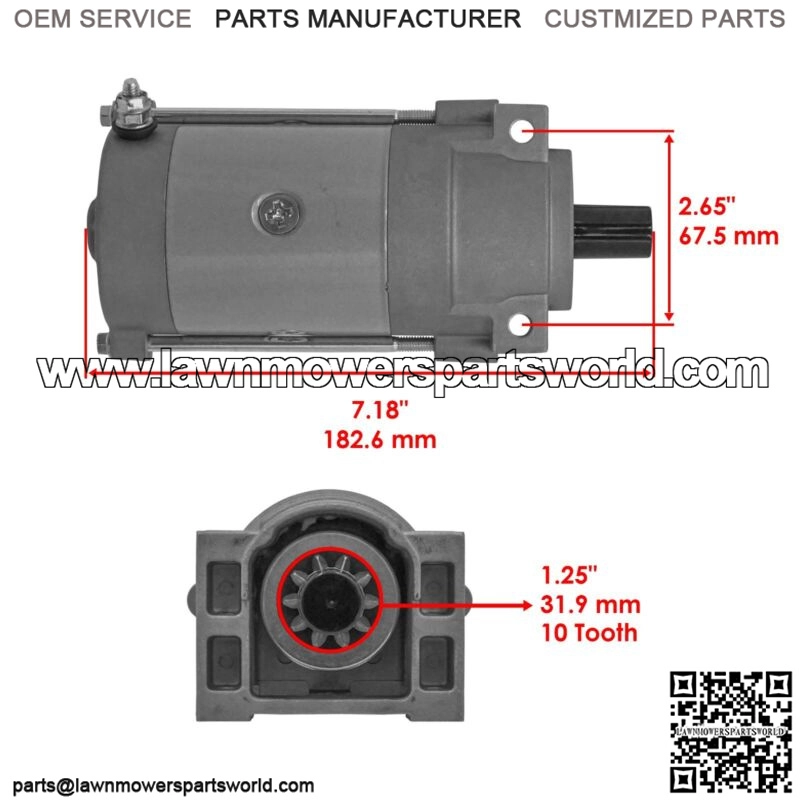 Premium Quality Replacement PartStarter MotorFor Exmark / Toro / Lawn-Boy Models:ExmarkQZE702GEM34200 – Exmark 34″ Quest E-Series Zero-Turn Mower, Exmark 702 (SN: 406294345 – 408644345) (Rev A) (2020)QZE702GEM42200 – Exmark 42″ Quest E-Series Zero-Turn Mower, Exmark 702 (SN: 406294345 – 408644345) (Rev A) (2020)QZE708GEM34200 – Exmark 34″ Quest E-Series Zero-Turn Mower, Exmark 708 (SN: 402082300 – 404314158) (2018)QZE708GEM42200 – Exmark 42″ Quest E-Series Zero-Turn Mower, Exmark 708 (SN: 402082300 – 404314158) (2018)QZS708GEM50200 – Exmark 50″ Quest S-Series Zero-Turn Mower, Exmark 708 (SN: 402082300 – 404314158) (2018-2020)QZS708GEM54200 – Exmark 54″ Quest S-Series Zero-Turn Mower, Exmark 708 (SN: 408644346 – 411294211) (Rev A) (2021-2023)QZS708GEM60200 – Exmark 60″ Quest S-Series Zero-Turn Mower, Exmark 708 (SN: 402082300 – 404314158) (2018-2019)RAE702GEM44300 – Exmark 44″ Radius E-Series Zero-Turn Mower, Exmark 702 (SN: 404314159 – 406294344) (2019-2020)RAE708GEM44300 – Exmark 44″
