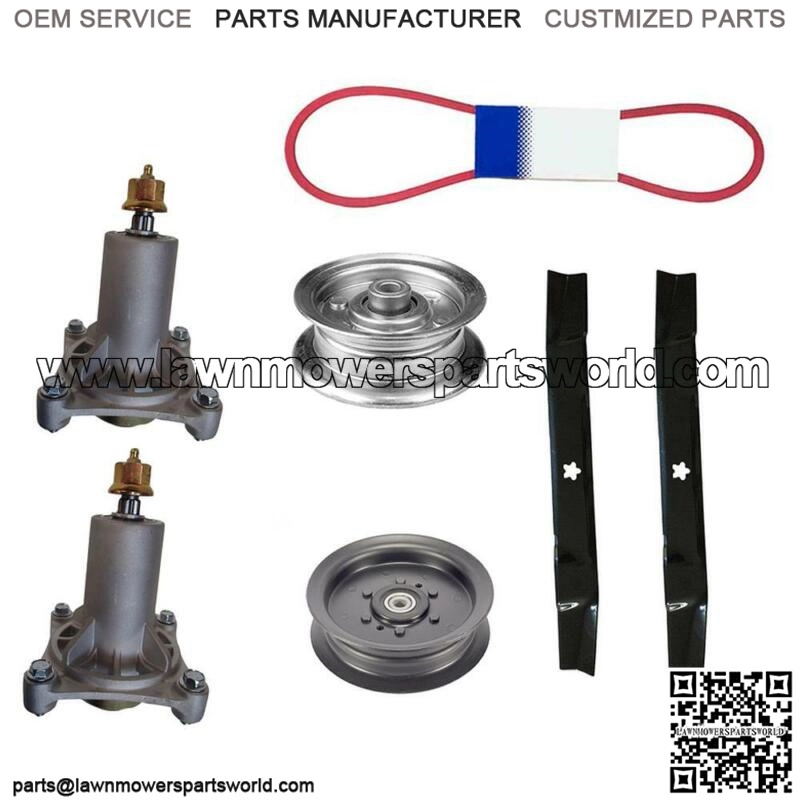 One New Aftermarket Replacement 42″ Deck Rebuild KitKit Includes:(2) Spindle AssemblyReplaces Part Number(s): Fits Husqvarna 532187292Tech Info:4-Bolt Long Housing.5 Point Star Center Hole.Threaded Mounting Holes include Bolts.(2) Mulching Lawn Mower BladeReplaces Part Number: Fits Husqvarna 532134149Tech Info:Length: 21″Width: 2-1/4″Center Hole: 5 Point StarThickness: .134″Mulching Blade(1) Flat Idler PulleyReplaces Part Number: 532193197Tech Info:Height: 1-7/16″ID: 3/8″OD: 4″Material: MetalHe