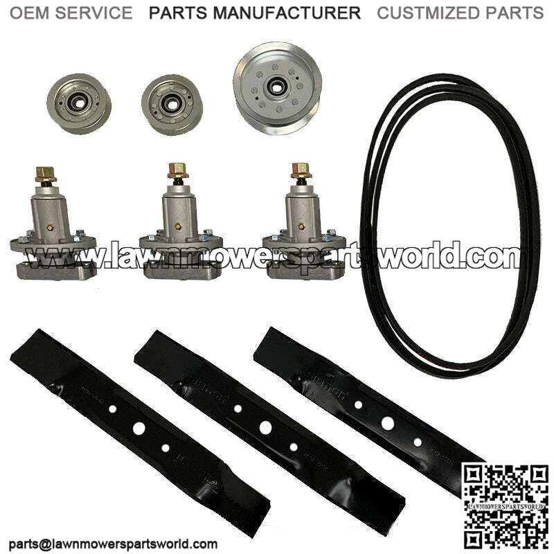 JOHN DEERE 48″ DECK REBUILD KIT GY20996 FOR L120 L130 GY20050 GX20305 GY20067YOU ARE BUYING (1) BRAND NEW 48″ JOHN DEERE MOWER DECK SPINDLE & BLADE KIT ASSEMBLY.KIT INCLUDES:(3) SPINDLES, (3) BLADES, (1) DRIVE BELT, (2) IDLER PULLEY, (1) FLAT IDLER PULLEYSPINDLE REPLACES OEM# JOHN DEERE: GY20050, GY20785SPECS:HEIGHT: 6 3/8″ OVERALL WITH GREASE FITTING*DOES NOT INCLUDE BOLTS, AND HOLES ARE NOT TAPPEREDBLADES REPLACES OEM# JOHN DEERE: GX20250, GY20568SPECS:LENGTH: 17″ CENTER HOLE: 11/16″ OUTER HOLE: 3/8″ CENTER TO CENTER: 3 11/16″ WIDTH: 2 1/2″ THICKNESS: .164″FITS MODELS:JOHN DEERE L120 AND L130 WITH 48″ DECK SABRE MOST WITH 48″ DECK SCOTTS L2048 AND L2548 (2002) SERIES WITH 48″ DECKBELT REPLACES OEM#JOHN DEERE: GX20305, GY20571SPECS:BELT APPLICATION: ENGINE TO DECK BELT TYPE: COVERED WIDTH: 1/2″ LENGTH: 139″FLAT IDLER PULLEY REPLACES OEM# JOHN DEERE: GY20110, GY20629SPECS:HEIGHT: 1 3/4″ ID: 11/16″ OD: 5 1/8″FLAT IDLER PULLEY REPLACES OEM# JOHN DEERE: GY20067SPECS:HEIGHT: 1 3/16″ ID: 11