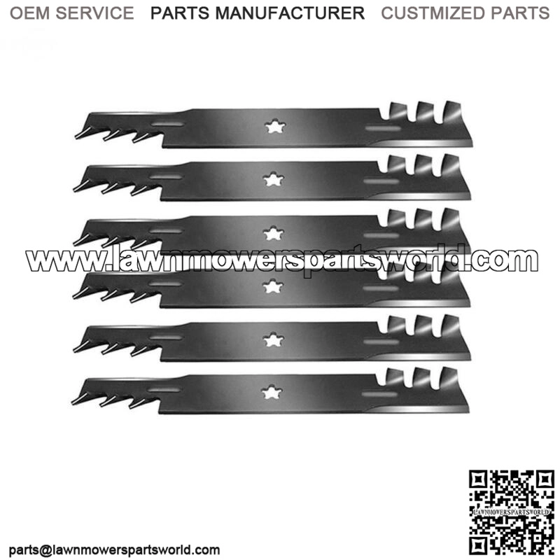 One New Aftermarket Replacement Toothed Mulching Mower Blade(3) Blades for 52″ cut. Tech Info:Length: 18″Width: 2-1/2″Thickness: 13/64″Center Hole: 5 Point StarReplaces Part Number: 521981501