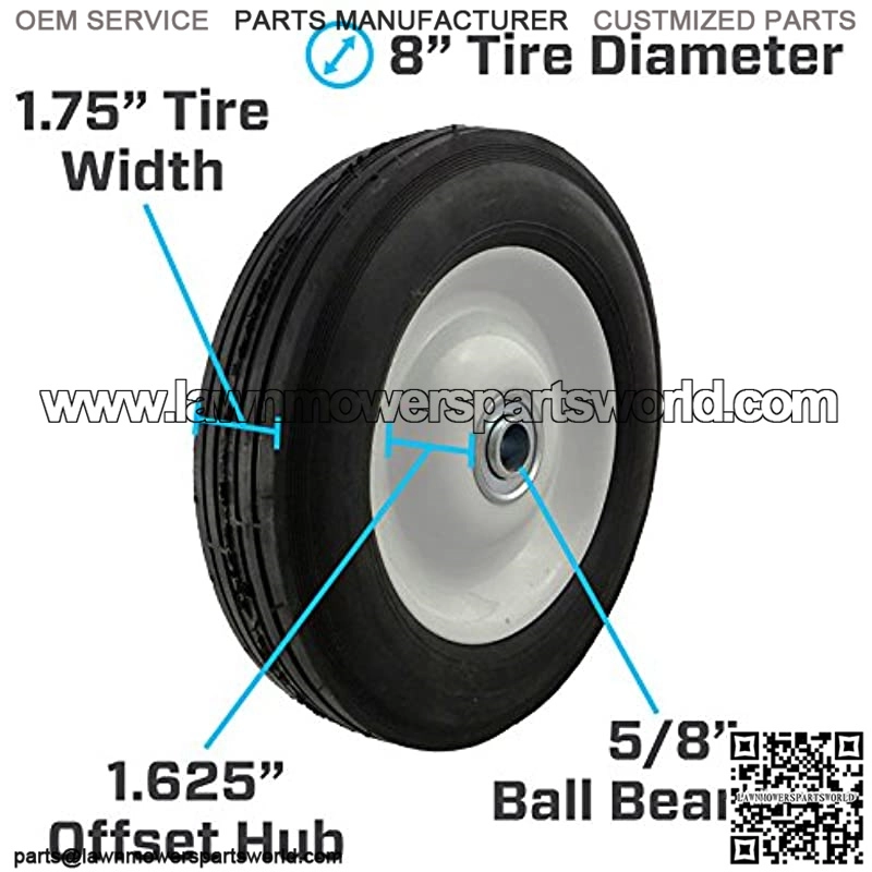 8×1. 75″ Tire. 8″ Tire diameter. 1.75″ Tire width. Semi-pneumatic tire Made of rubber. Ribbed tread. No flats! 1.625″ Offset hub. 5/8″ Ball bearings. Multi-purpose replacement tire. 225 lb load capacity. Not for highway use.