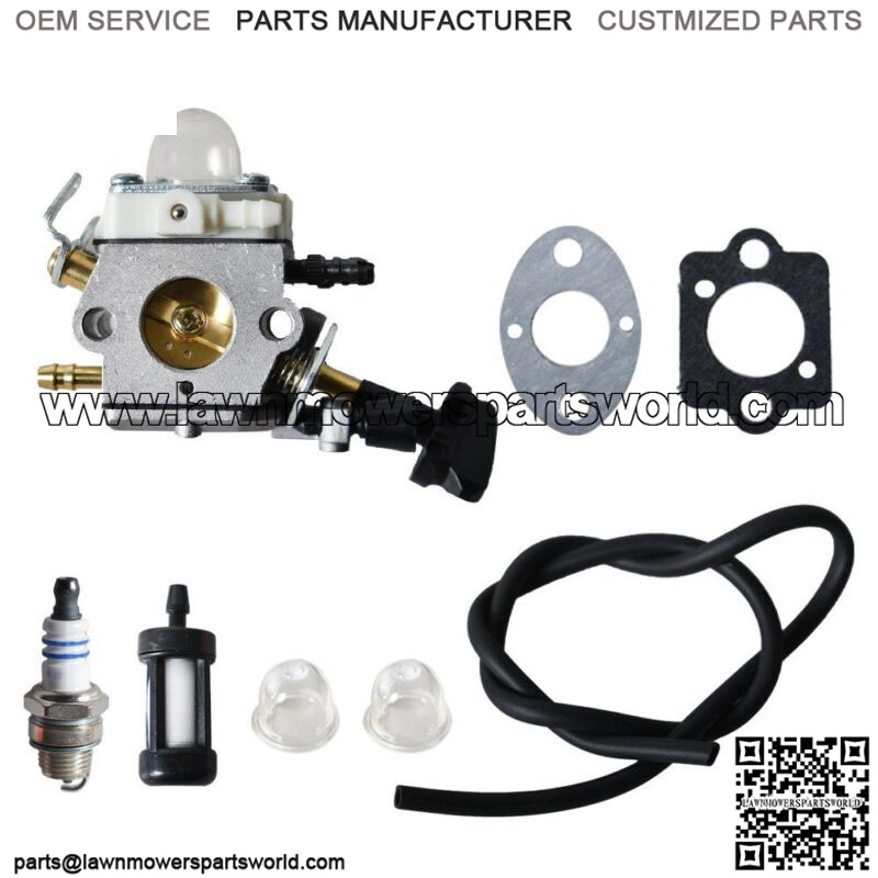 1 Carburetor + 2 Gaskets + 1 fuel filter + 2 feet fuel line + 1 spark plug + 2x Primer Bulbs