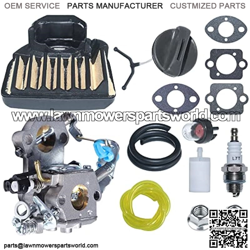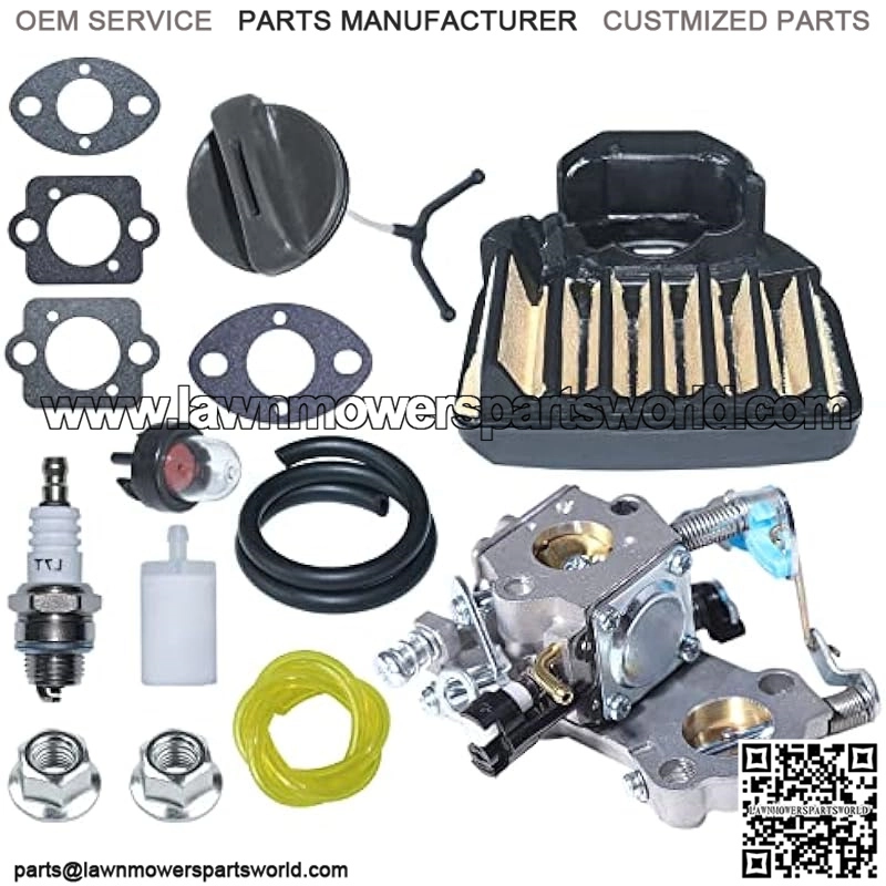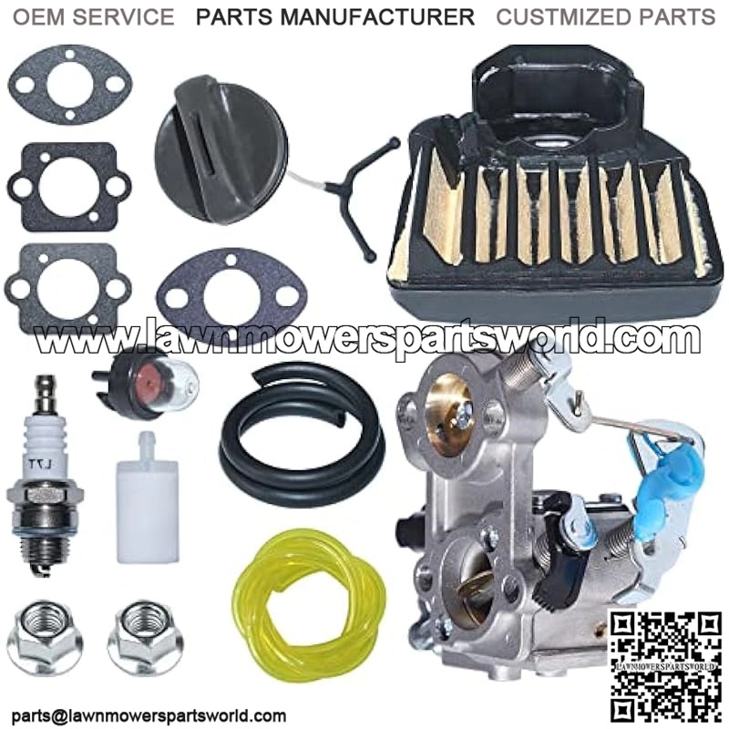[Package includes]:1 x Carburetor Assembly, 1 x Air Filter, 1 x Gas Cap, 1 x Spark Plug, 1 x Fuel Filter, 1 x Yellow Fuel Line, 1 x Black Fuel Line, 1 x Primer Bulb, 2 x Bar Nut, 2 x Carb Gaksets.