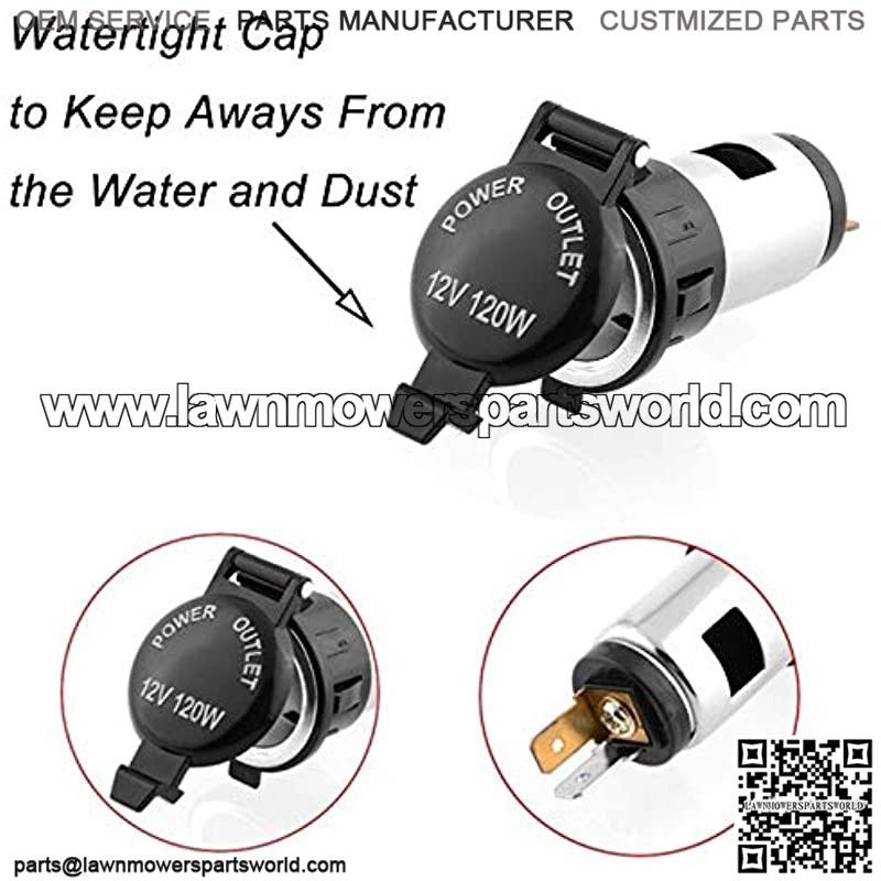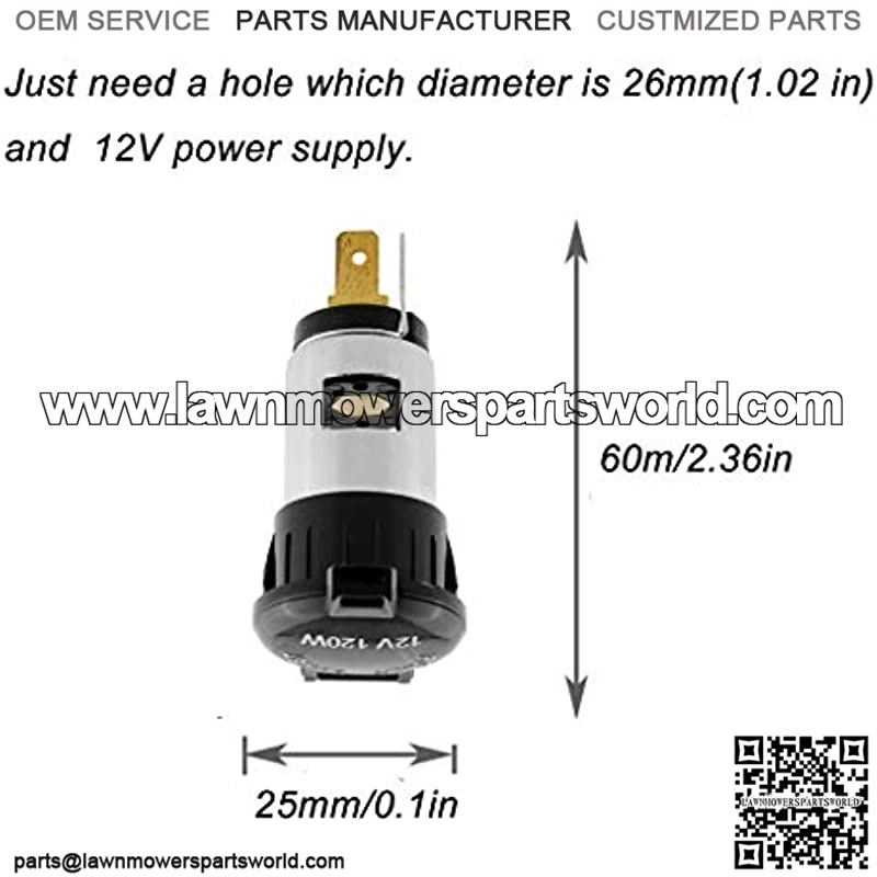 HIGH QUALITY MATERIAL: The cigarette lighter socket made of corrosion resistant materials to ensure solid contact and low voltage drop. It has watertight cap to keep aways from the water and dust ACCURATE SIZE: The electronic cigarette lighter size is 60mm x 25mm(2.36 in x 0.1in). You just need a hole which diameter is 26mm(1.02 in) that you can insert it. It is convenient that the central electrode can be twisted. EASY TO INSTALL: This 12v cigarette lighter outlet is easy to use, just need to snaps the cigarette lighter socket in the hole, it will work anywhere you can mount it and run the leads to the 12v power supply. WIDELY USE: The car auxiliary socket power outlet fits for all 12V accessory plugs, apply to any DC, 12V motorcycles, boats, mowers, tractors, cars, etc. Work perfectly with any car powered devices WAT YOU GET: 1pcs perfect 12V 120W cigarette lighter socket! It will be protected when the current is to high. Don??t worry about the current in your car