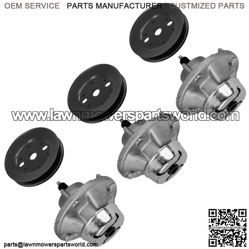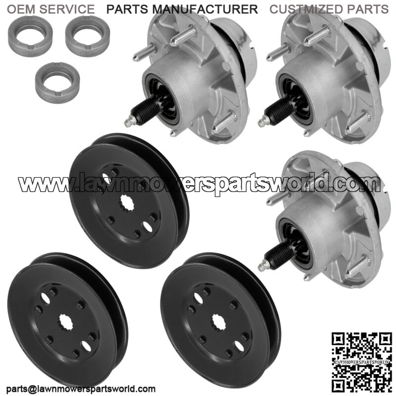 Premium Quality Replacement PartSpindle Assembly w/PulleyFor John Deere Models:X534 Multi-Terrain Tractor with 48-inch or 54-inch Mower Deck – PC9526Order Includes:3 x Spindle Assembly | AM144377 AM124498 AM131680 AM1353493 x Pulley | UC21496 M155375Dimensions & Measurements :Spindle Assembly Height : 131mm | 5.15″Mounting Hole Distance : 107mm | 4.21″Hub Diameter : 127mm | 5.0″ PulleyWidth : 25mm | 0.98″Inner Diameter : 19mm | 0.74″Outer Diameter : 130mm | 5.1″**