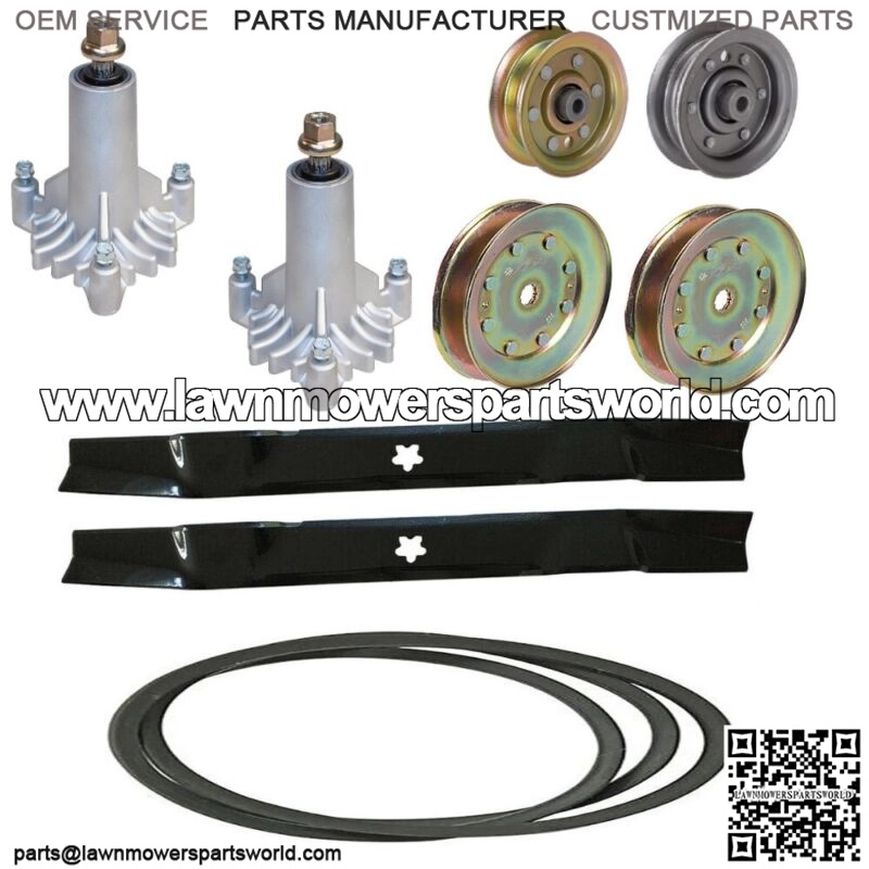 One New Aftermarket Replacement 42″ Rebuild KitKit Includes: (2) Spindles, (2) Blades, (2) Pulleys, (1) Belt, (1) Idler Pulley, (1) Idler PulleyTech Info For Each Part in the Kit:Flat Idler Pulley -Flat Idler w/ FlangesSteelDrive belt and mower deck pulley on for many 12 through 22 HP front engine tractors3.875″ (3 7/8”) OD0.375” (3/8″) IDSpindle Assembly -3-Bolt Long5 Point Star Center HoleComes With Mounting BoltsMulching Lawn Mower Blade -Fits Craftsman 42″ DeckRequires 2 Blades for 42″ DeckLength: 21″Width: 2-1/4″Center Hole: 5 Point StarThickness: .134″Mulching BladeFlat Idler Pulley -SteelFits 42″ Decks, 2000 & Later3.06″ OD3/8″ IDDeck Belt –