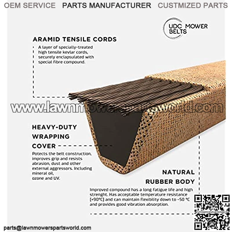 UDC Mower Belt ensure smooth running in typical lawn and garden machines where stop-and-start operations are commonplace. There is excellent adhesion to both tensile members and other fabrics, and the outer cover has a lowered coefficient which shows extreme resistance to belt turnover or roll.