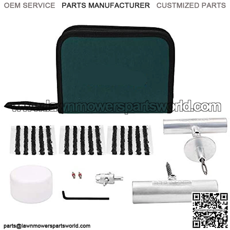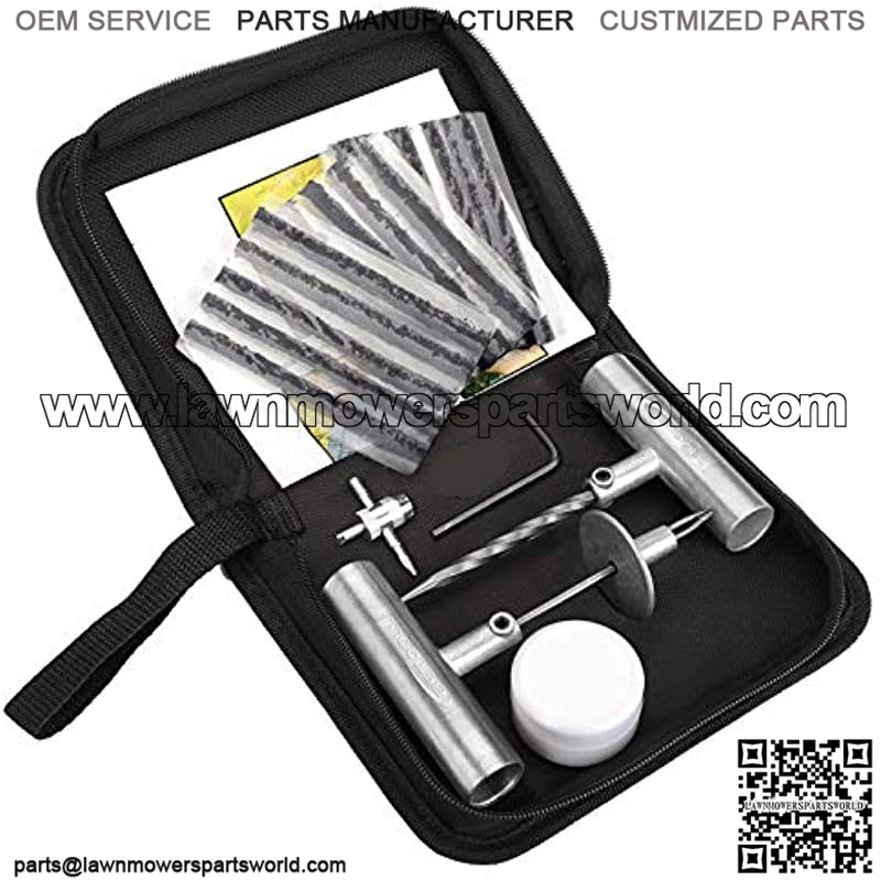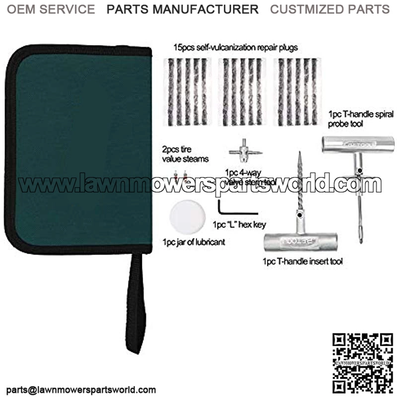 SIMPLE BUT COMPLETE— Includes 1pc T-handle insert tool, 1pc T-handle spiral probe tool, 1pc ??L?? hex key, 1pc jar of lubricant, 15pcs self-vulcanization repair plugs , 2pcs tire value steams and 1pc 4-way valve stem tool.