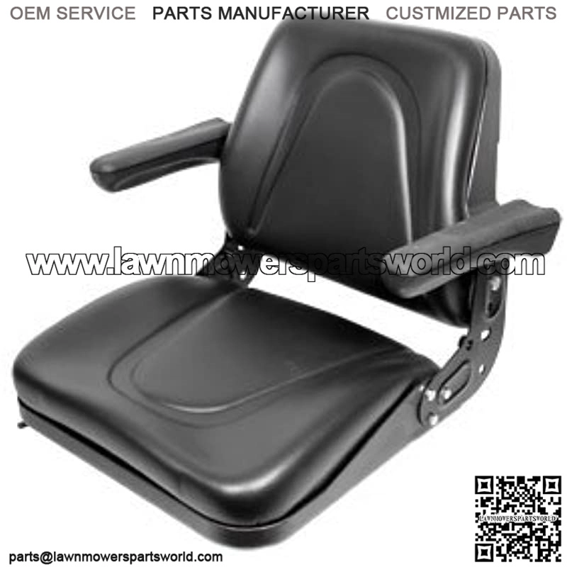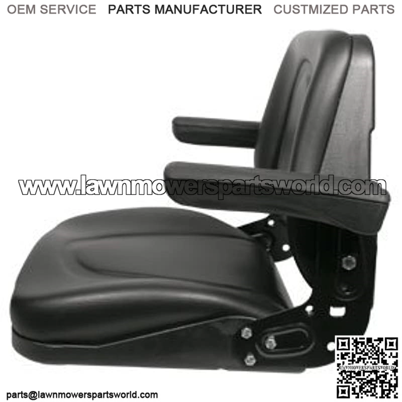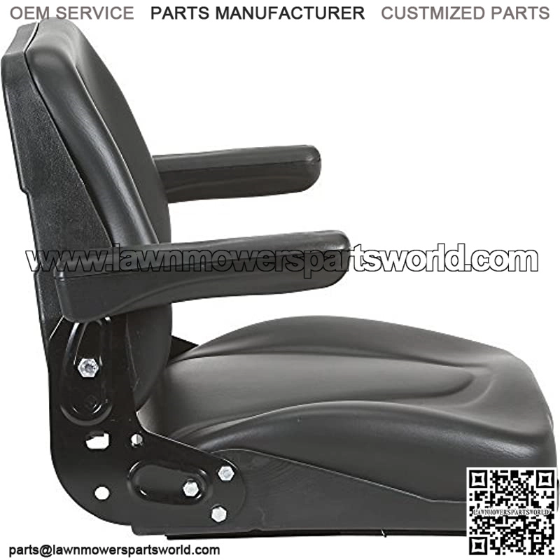 This A I Universal Black Seat with flip-up armrests fits most tractors, off-road equipment and mowers with flat mounting bases. Contoured design for comfort and support. Shell: Vinyl, Color: Black, Application: Highback seat